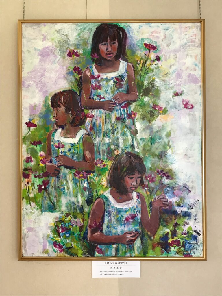 素敵な絵が飾られてあります 緑光会副会長、県美展無鑑査、国画会準会員で、ひろすけ童話感想画全国コンクール審査員の清水恵子先生より、素晴らしい絵画2点 ( 「コスモスの中で」、「ゆりの花咲く頃」 ) を寄贈していただき、館内に飾らせていただきました。ありがとうございました。 来館の際には、是非ご覧になっていただきたいと思います。 「コスモスの中で」 「ゆりの花咲く頃」