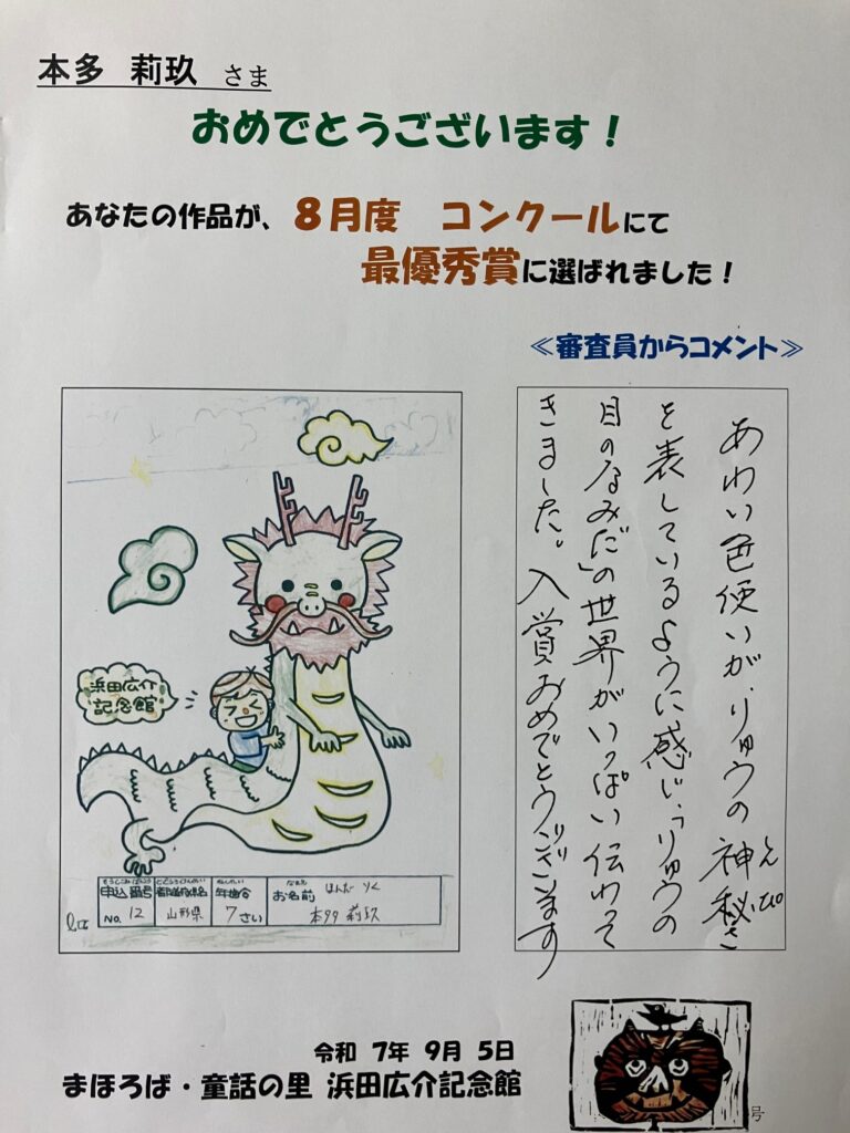 子どもたちはまだまだ夏休みが続きますね。感想文や絵の宿題があると思います。ぜひ記念館で主催している「ひろすけ童話感想文・感想画全国コンクール」「ひろすけ童話造形創作コンクール」に応募してくださいね。素敵な作品に出合えること、楽しみにしています。