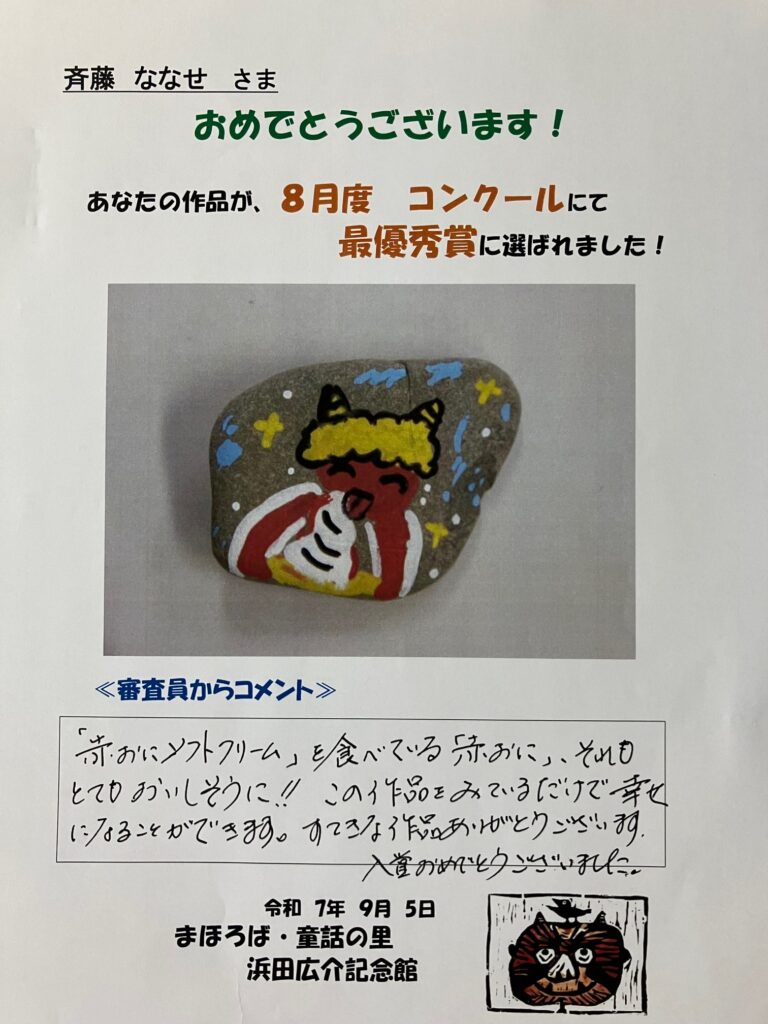 8月は夏休み期間中ということもあって、多くの方に来館いただきました。ありがとうございました。その中で小石・ぬり絵コンクールへの参加も多く、特に小石コンクールでは幼児・児童・一般の部合わせて47作品の参加をいただきました。どの作品もひろすけ童話の世界を感じさせる素敵な作品ばかりでした。
