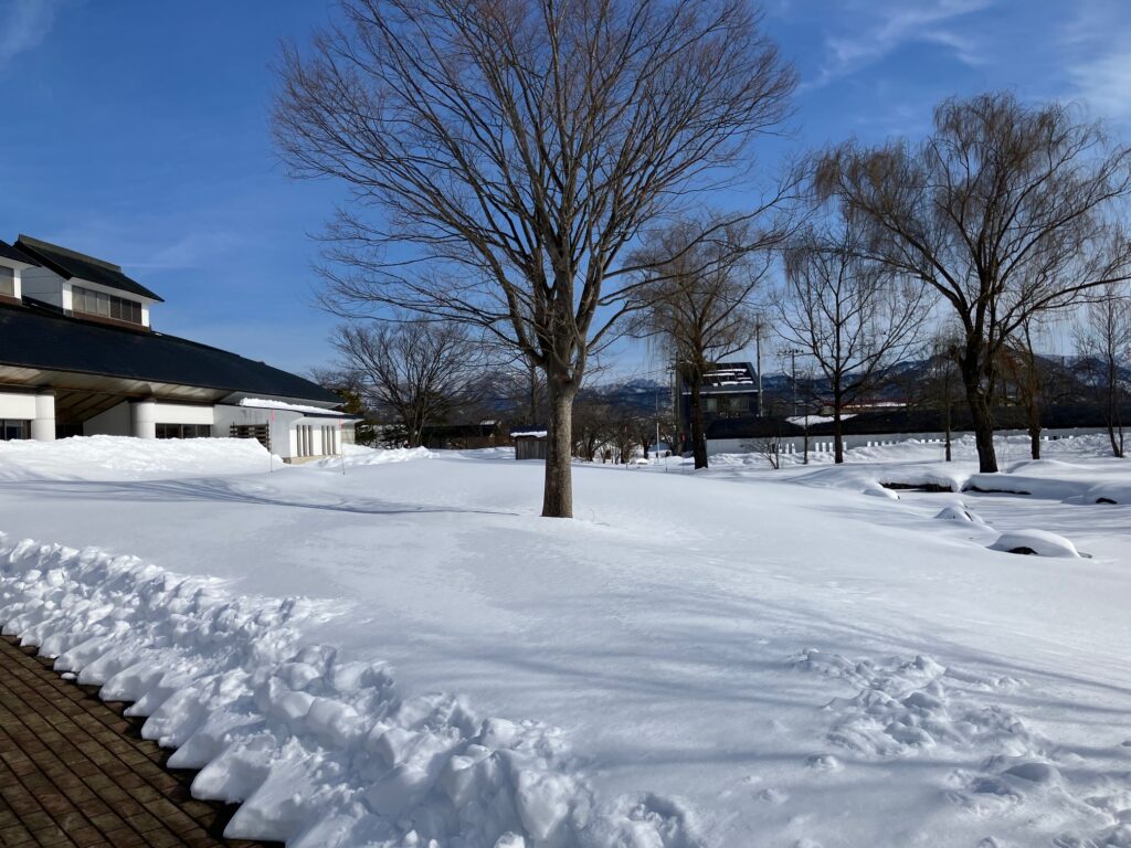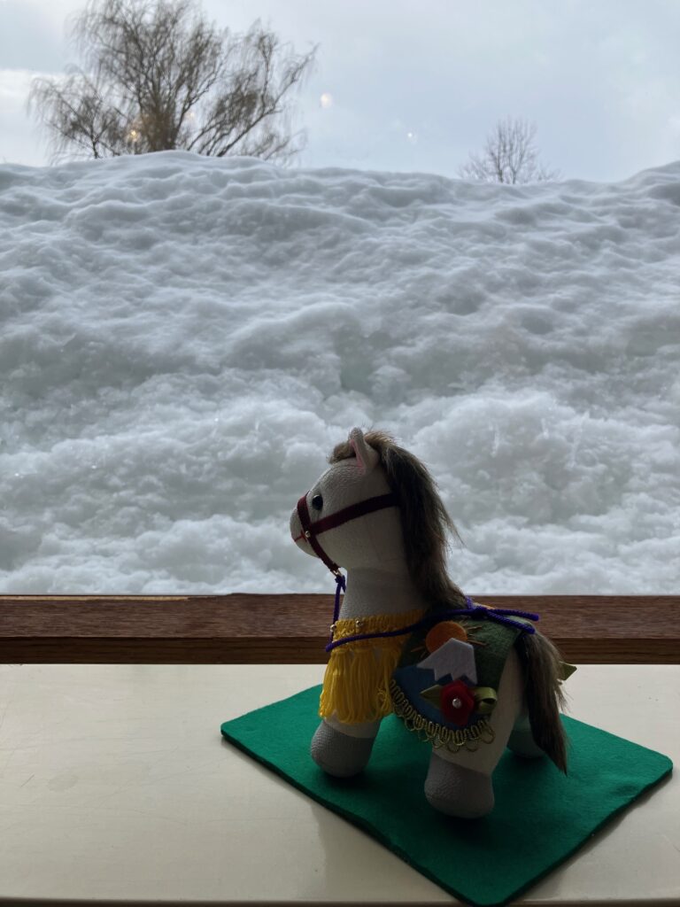 春を感じさせる陽気です 昨日までの寒波の影響での寒さから一転、今日は朝から春の訪れを感じさせるような暖かな日差しを記念館も浴びています。久しぶりに気持ちの良い一日を過ごしています。 周囲の雪も、その日差しを浴び、キラキラに輝いたり、溶けだした形が自然が作り出したアートのようになったりして、素敵な風景を作り上げています。記念館の中に干支の午さんも、嬉しそうに(???)外を眺めています。