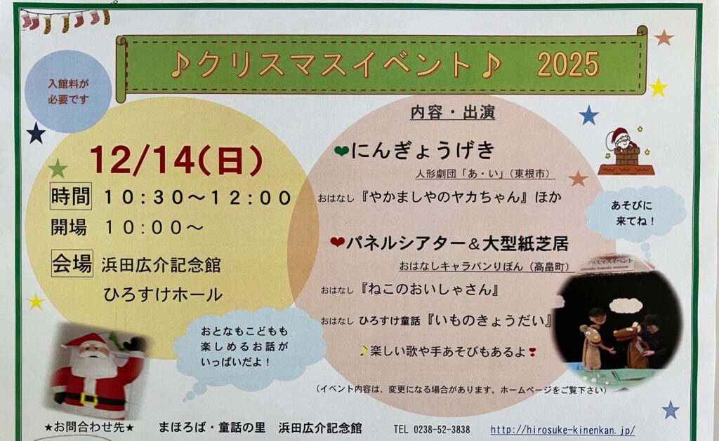 広介記念館恒例の「クリスマスイベント」を今年も14日(日)に開催します。今年の内容は、毎年来てくださる人形劇団「あ・い」さんのおはなし『やかましやのヤカちゃん』他、そして地元高畠町の「おはなしキャラバンりぼん」さんの『パネルシアター&大型紙芝居』です。